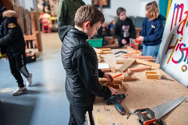 We made a creative activity that let members build their own mini-cameras (zero-tech viewfinders) which they could decorate to show how and why they might be used, before picking ‘photos’, little art-challenges to complete and put inside their cameras. These challenges asked kids to think about the things around them i.e. things you could make, things you wouldn’t find in a museum… and let us see through their eyes.Rickard took the lead on woodwork, giving North Tyne Youth a chance to do some building in the woodwork room for the first time. Members continued on with the giant Making History sign from the Roundhouse workshop, with beautiful attention to detail. They got the whole sign finished, ready for decoration!